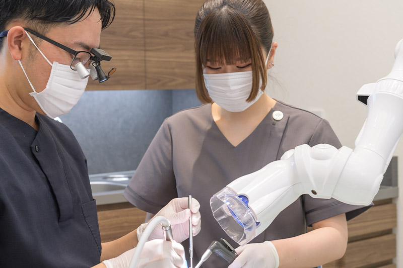患者様と落ち着いて向き合えるよう、個室の予防ルームを設置しています。また最新の治療・検査機材に加え、ミーレ自動洗浄機や各種医療滅菌機器、全ユニットに口腔外バキュームも導入。もちろん患者様ごとのグローブ交換やユニットの清掃も徹底しています。