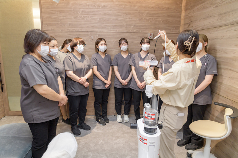スタッフに合わせた実習内容を決めて、歯科医師や先輩衛生士が講師となって教えます。診療中に感じた疑問点な悩みなども話し合い、知識・技術を高めあっています。